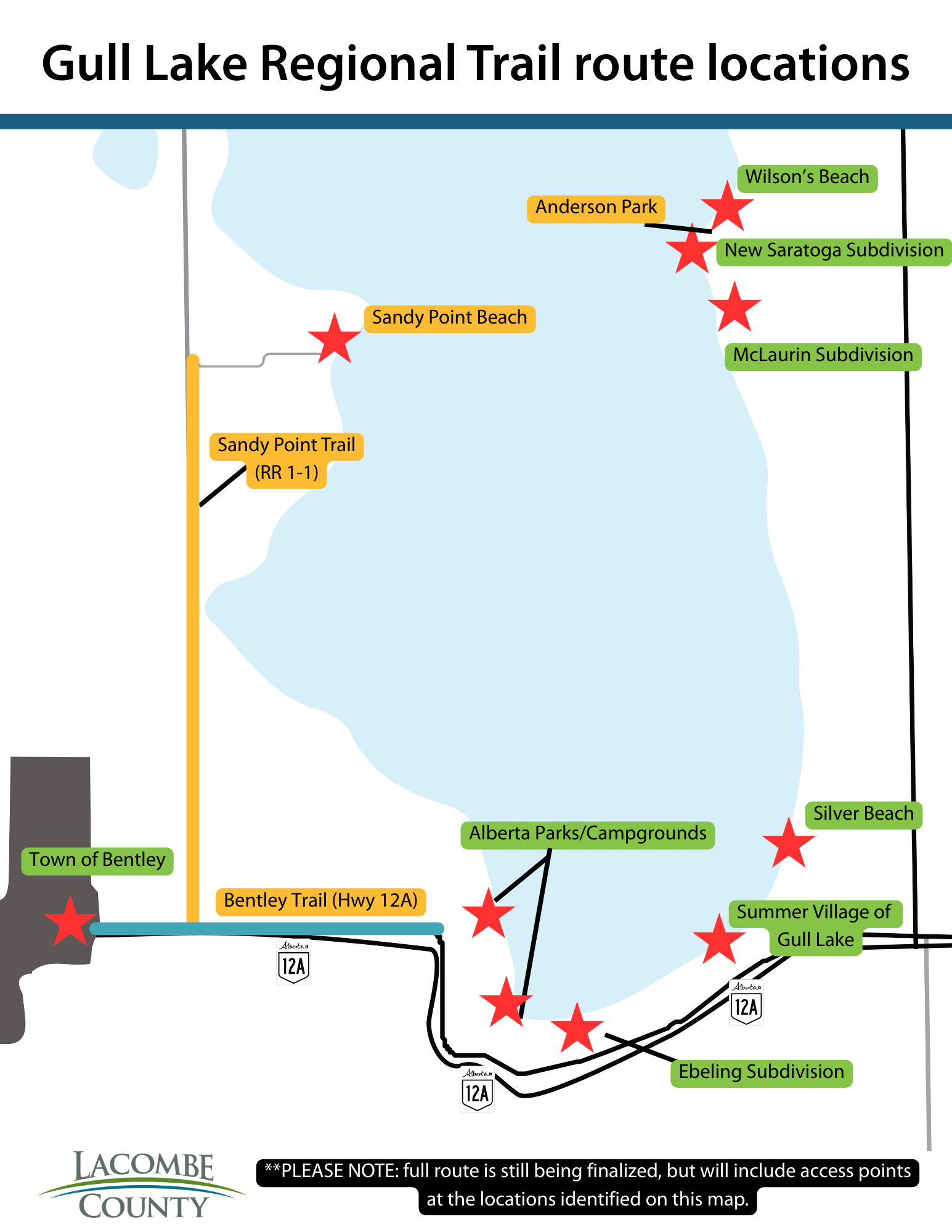 Once complete, the trail will connect Bentley and Sandy Point on the west with Alberta Parks, Ebeling Subdivision, and the Summer Village of Gull Lake to the south, and extend to McLaurin, New Saratoga, and Willsons Beach on the east.